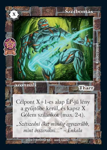 Kiadás: Varázsdimenzió Gyakoriság: gyakori Lapszín (isten): Tharr Típus: azonnali Altípus: - Szöveg: Célpont X+1-es alap ÉP-jű lény a gyűjtőbe kerül és kapsz X Gólem szilánkot (max. 2-t). Szinesítő szöveg: "Szétszedni őket mindig egyszerűbb, mint összerakni..." - Enkala Illusztráció: Kovács József