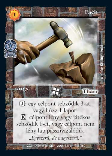 Kiadás: Varázsdimenzió Gyakoriság: nem gyakori Lapszín (isten): Tharr Típus: tárgy Szöveg: (J): egy célpont sebződik 3-at, vagy húzz 1 lapot! (K): célpont lény vagy játékos sebződik 1-et, vagy célpont nem lény lap passzivizálódik. Szinesítő szöveg: "Egyszerű, de nagyszerű." Illusztráció: Kicsiny László